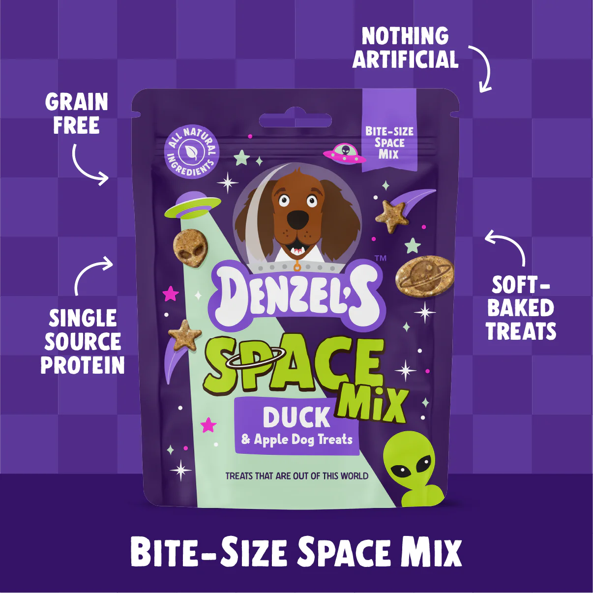 Treat your dog to Denzel’s Space Mix: bite-sized space themed treats shaped like planets, stars and aliens. Made with tasty duck and apple, our high quality, soft-baked treats are all-natural, low calorie and perfect for training. Flip over the pack and scan the QR code to see what’s written in your dog’s stars, while they chomp on treats that are out of this world.